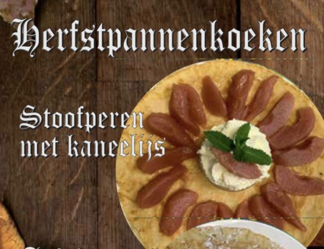Kom onze herfst pannenkoek proeven! Een heerlijke pannenkoek met stoofpeertjes, kaneelijs en slagroom!
